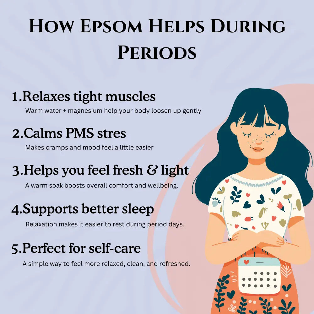 2 cups in a warm bath eases cramps. Magnesium absorbs to relax muscles. Pair with period panties & Menstrual cup